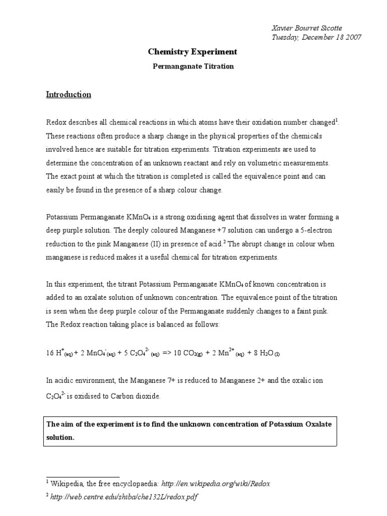 Chem 1300 Experiment 5 Lab Report. Experiment 8 Redox Titrations Potassium permanganate KMnO 4 is a strong oxidizing agent. It has all the parts you would need.